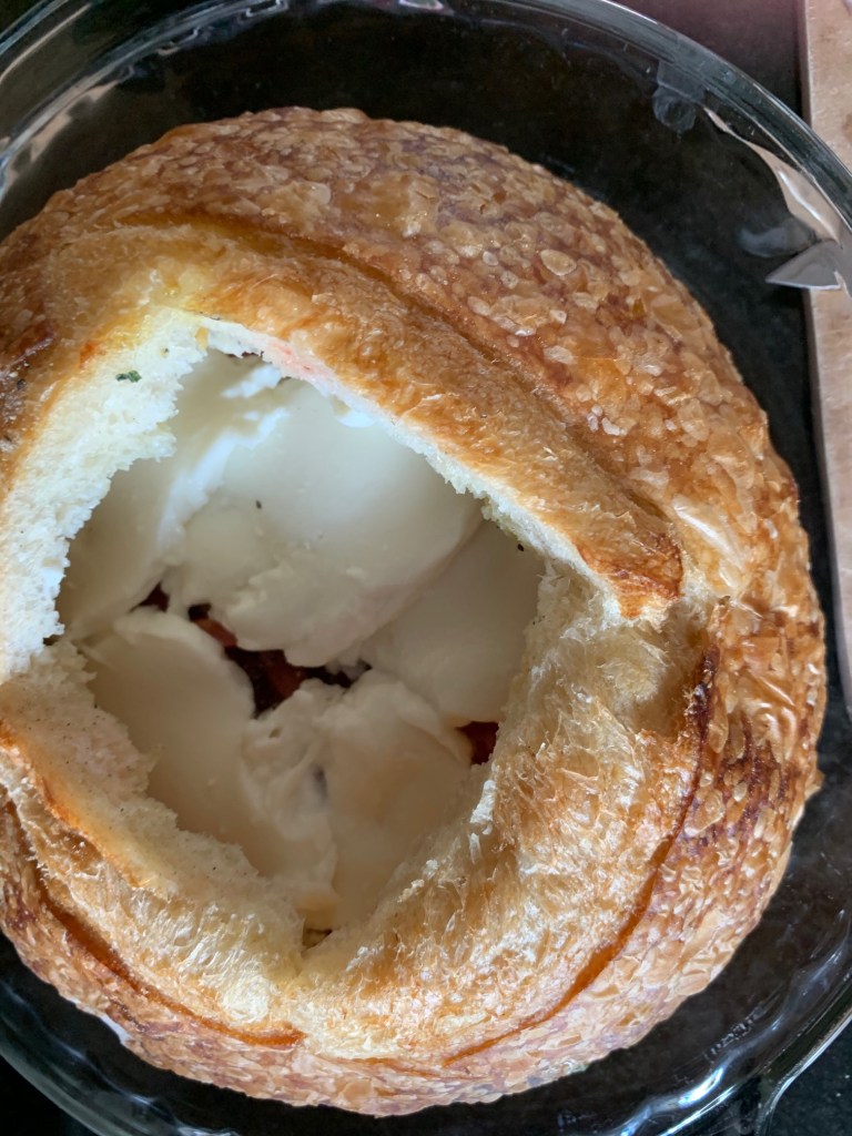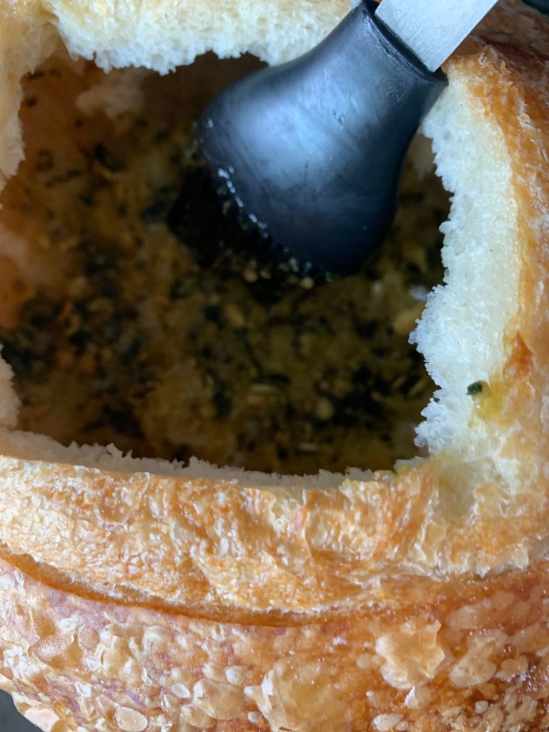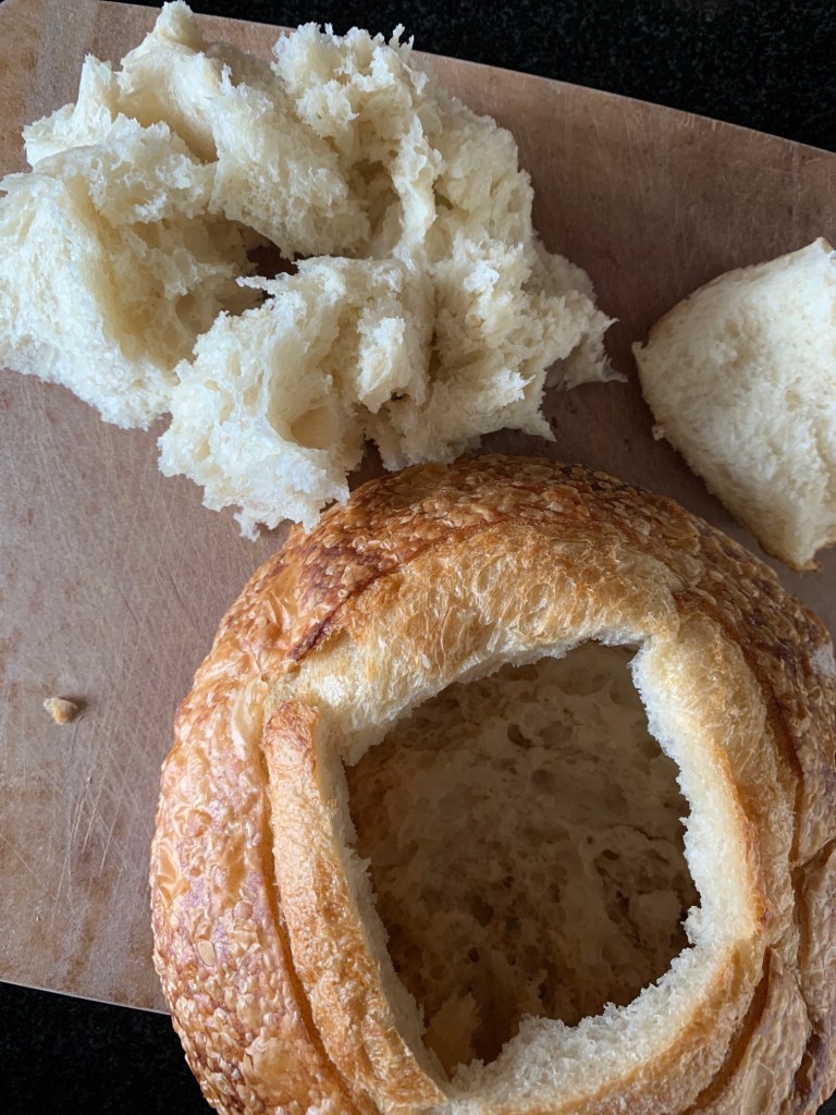 I cut the cap off of the bread and pull out the bread stuffing.
