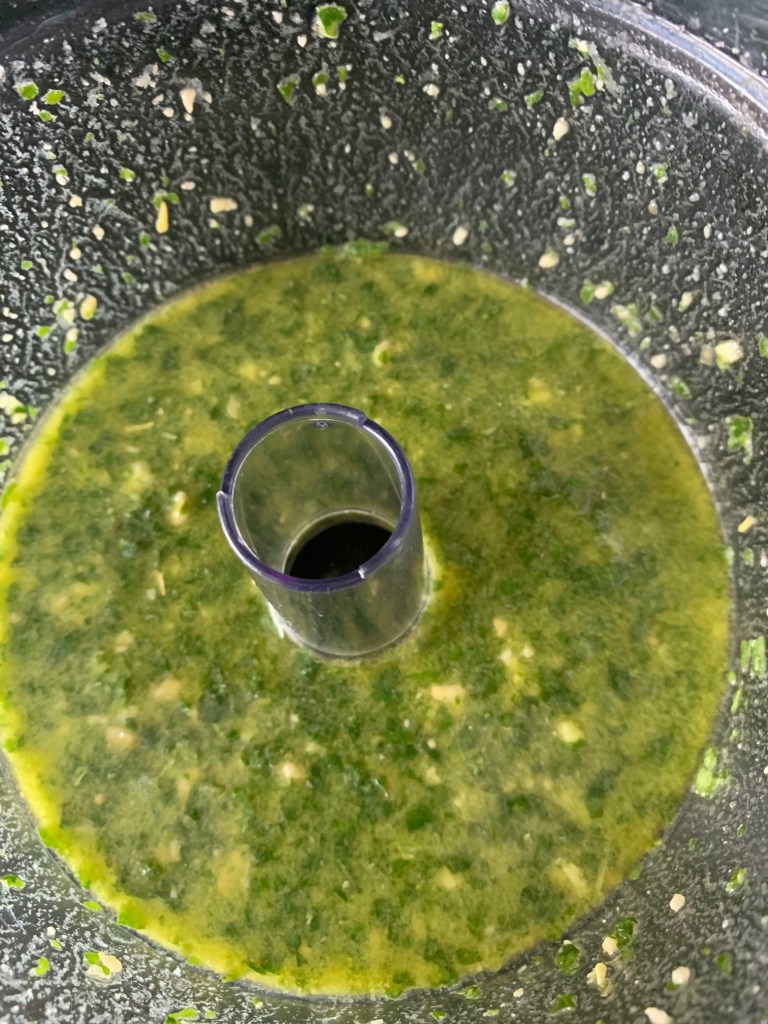 Blitz those ingredients until the basil has broken down, then drizzle about 1/4 cup of olive oil into the mix. Easy peasy.