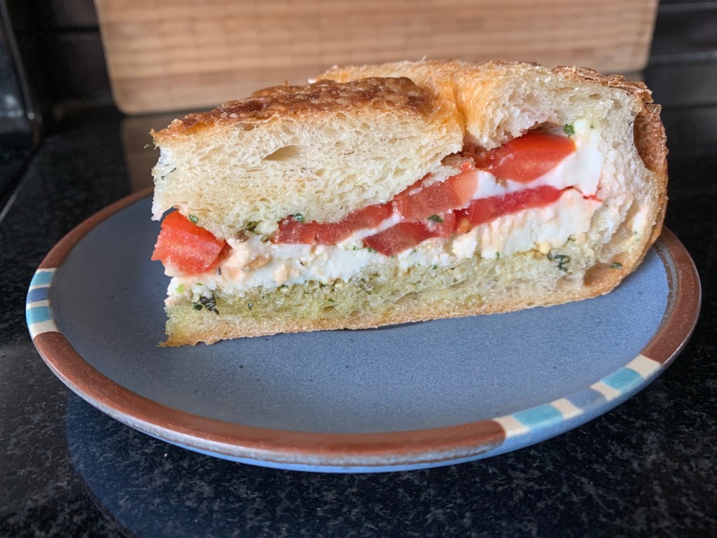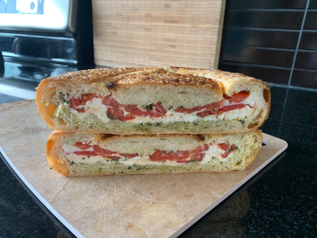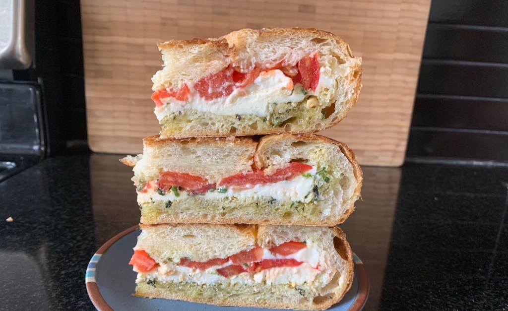 That got me thinking: how could I make pesto the star of a sandwich? Basil isn’t the only thing in season; tomatoes are, too. And I’ve got plenty of both. What if I turned caprese salad—tomato, fresh mozzarella, and pesto—into a sandwich?