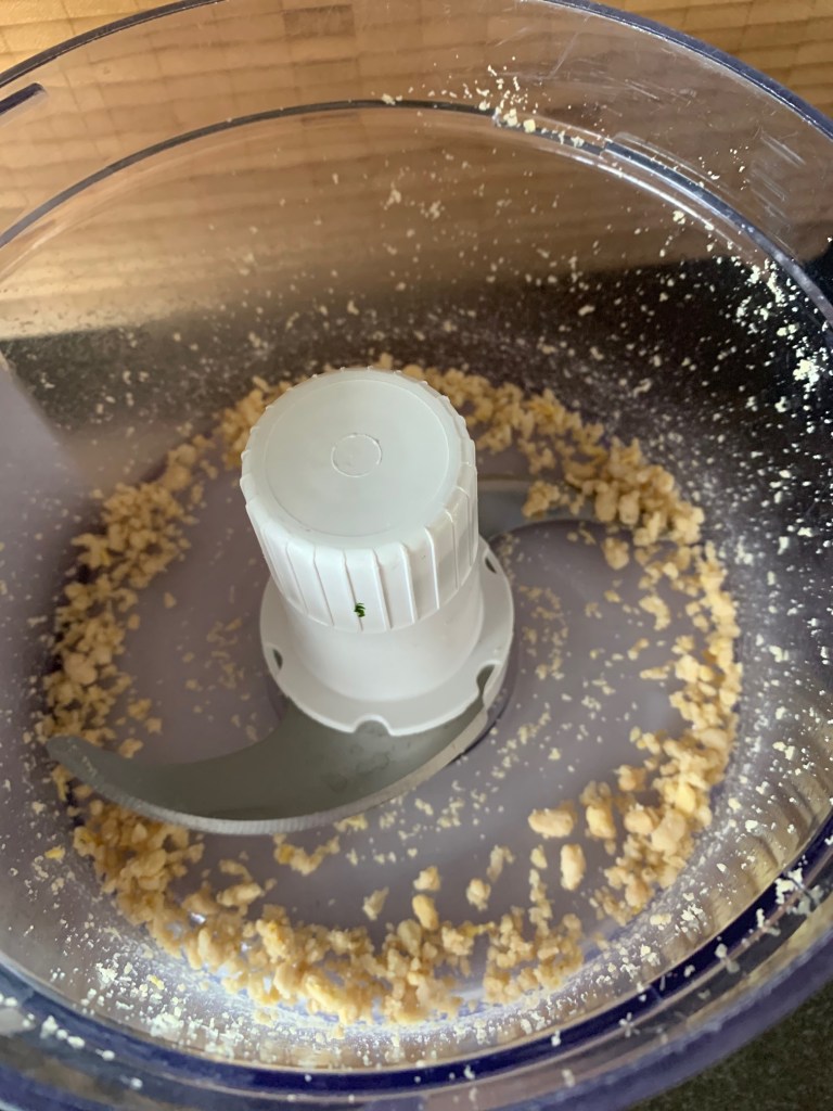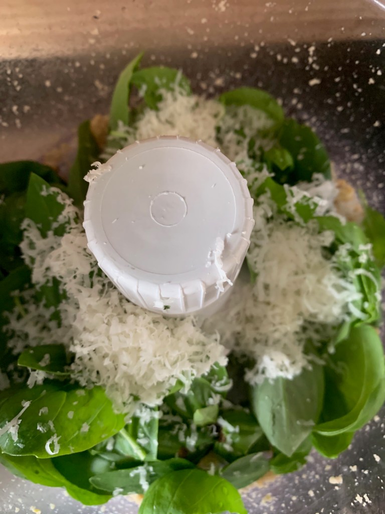 That goes into the food processor along with 2 minced garlic cloves and a healthy grating of parmesan (about 2 tbsp).
