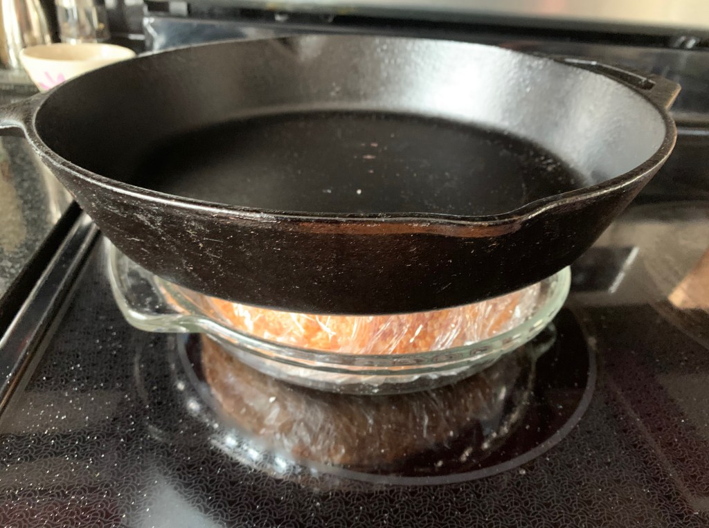 Tightly wrap the boule with plastic wrap, place it in a container (I used a pie plate) and top the wrapped sandwich with a heavy cast iron pan, pushing down to make the sandwich more compact.