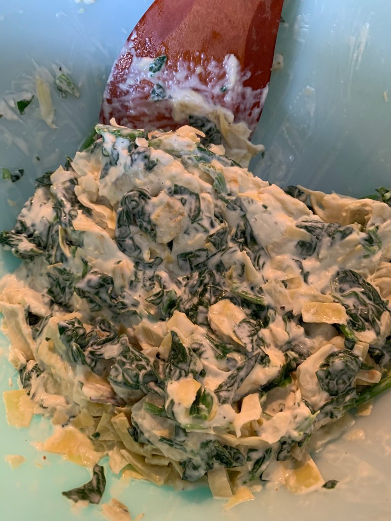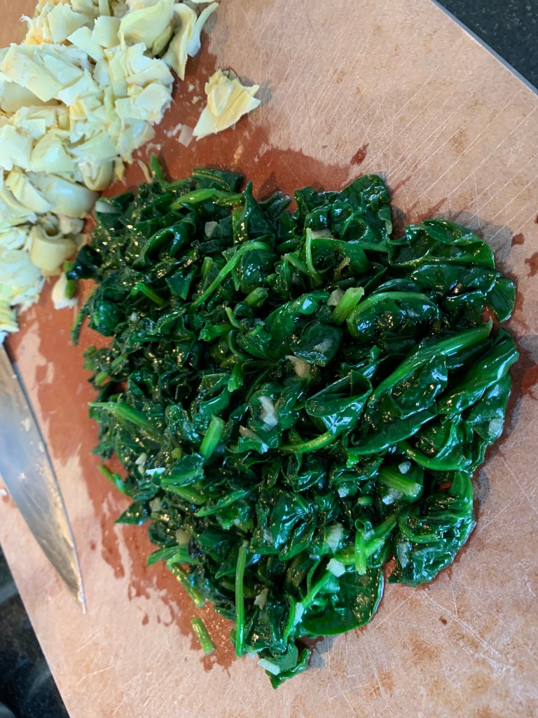Once the spinach is cooked down (wilted but some life left in it), transfer to a cutting board and coarsely chop. Do the same with the can of drained artichokes (squeeze those artichokes to get the moisture out).