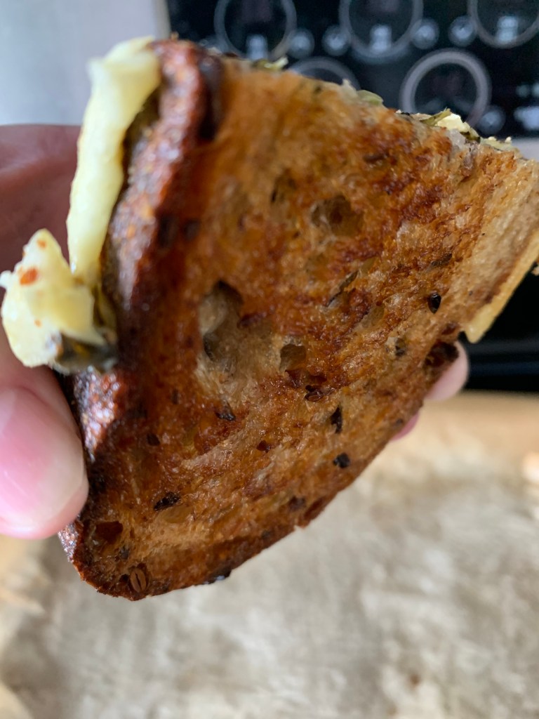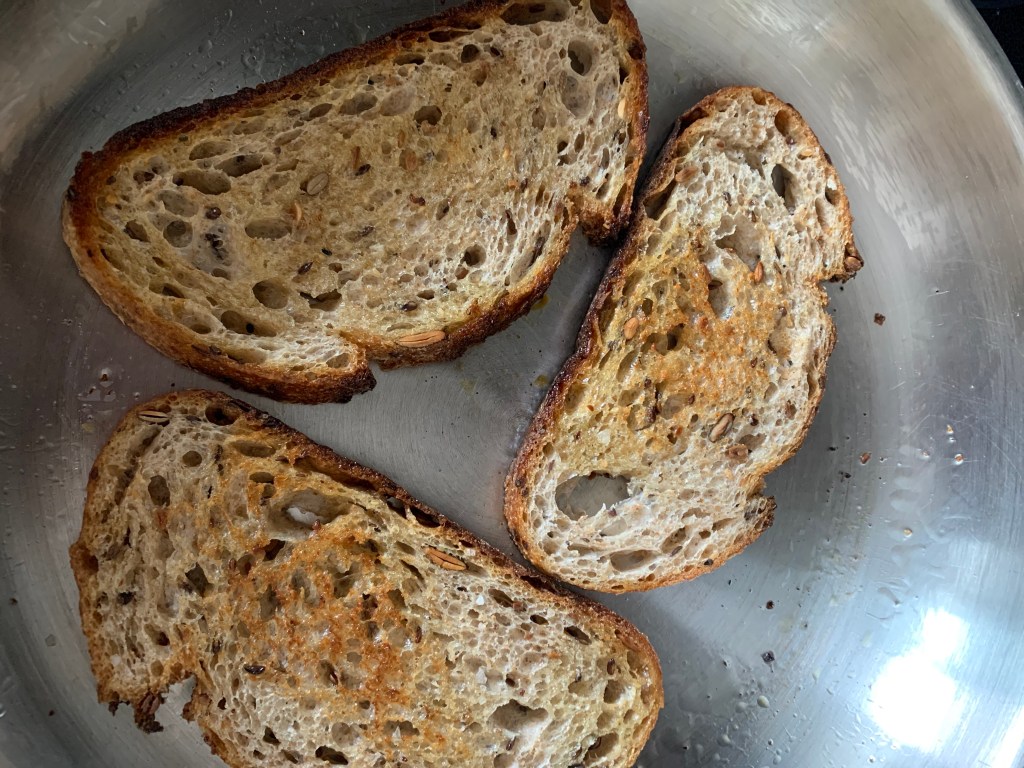 This can be made ahead and stored in the fridge until you’re ready to make your melts. I’m ready! You want a sturdy bread for your base—I’m using Blackbird Bakery seeded sourdough bread. Hardy and delicious. At this point you can toast the bread and then drizzle it with olive oil, broil the bread on both sides, or toast the bread in a fry pan with olive oil. I prefer this latter method because you can control the heat and hydrate the bread.