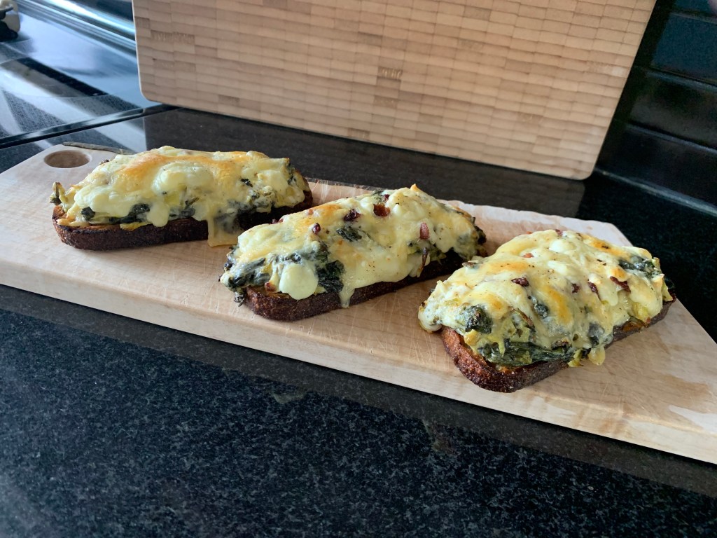 Heat the oven to 400 F. Take a baking sheet, line it with parchment paper, lay down the toast then top it with the spinach/artichoke mixture. Cover every inch.