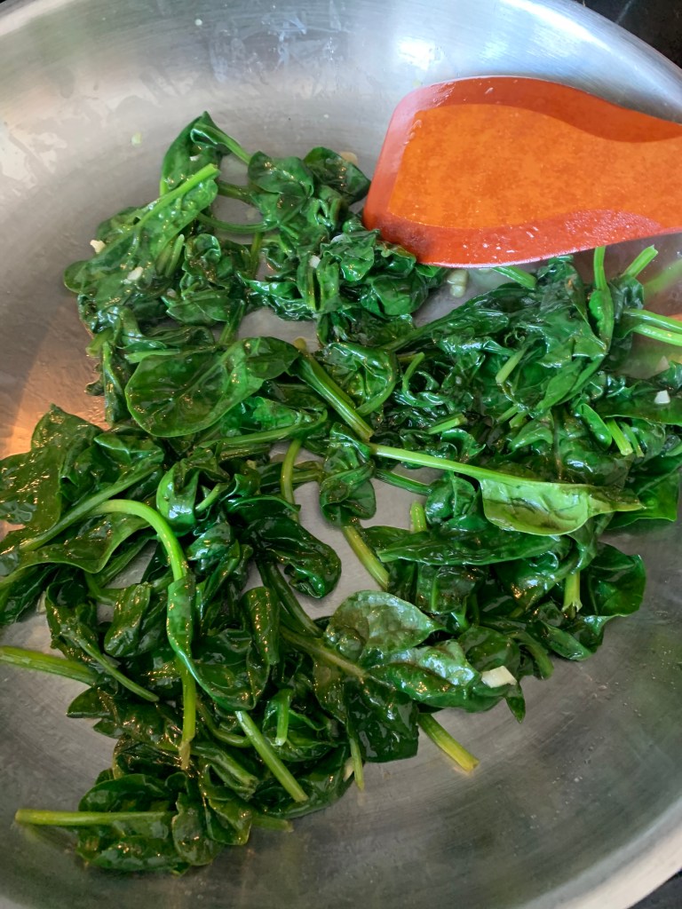 In most recipes, including the Bon Appetit recipe, it calls for boiling the spinach then squeezing the moisture out. I humbly disagree with this treatment. Better to sautee the spinach in a large fry pan on medium-high heat with a drizzle of olive oil and 1 large clove of garlic, minced. That garlic will infuse the spinach and there will be very little moisture to worry about.