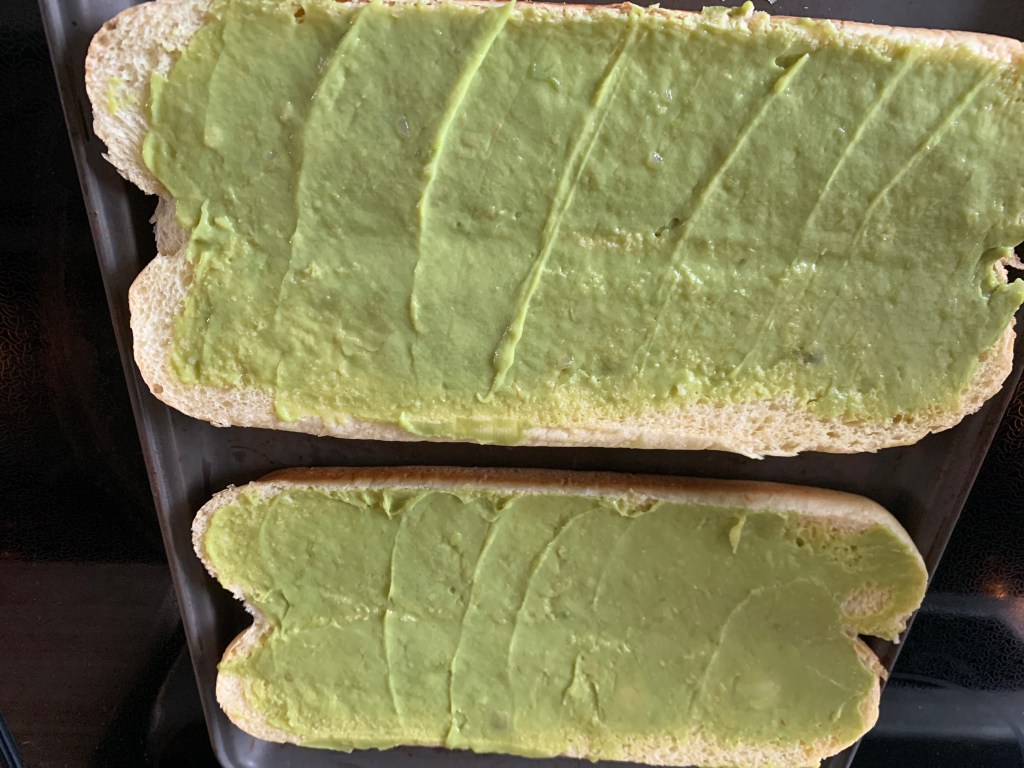 The guacamole is a major supporting actor in this sandwich, so you want to be generous with it. Normally I make my guacamole from scratch, but I guess because of COVID-19 supply chain issues, I’ve had a hard time finding good avocados. You know what? Yucatan guacamole is perfectly serviceable in this situation. It gets spread “wall to wall” on both cut sides of the sub roll.