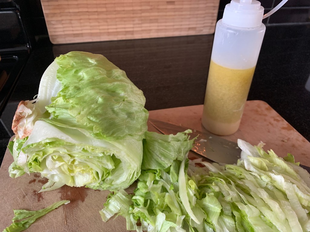 Well that looks delicious. Now all I have to do is top it with iceberg lettuce that’s been shredded and tossed in a homemade red wine vinaigrette: 1/3 red wine vinegar, 1 tsp dijon mustard, 2/3 olive oil, salt and pepper to taste. Or you could use a purchased vinaigrette. I just happen to usually have some kind of homemade salad dressing in my fridge to make the idea of eating a salad more enticing.