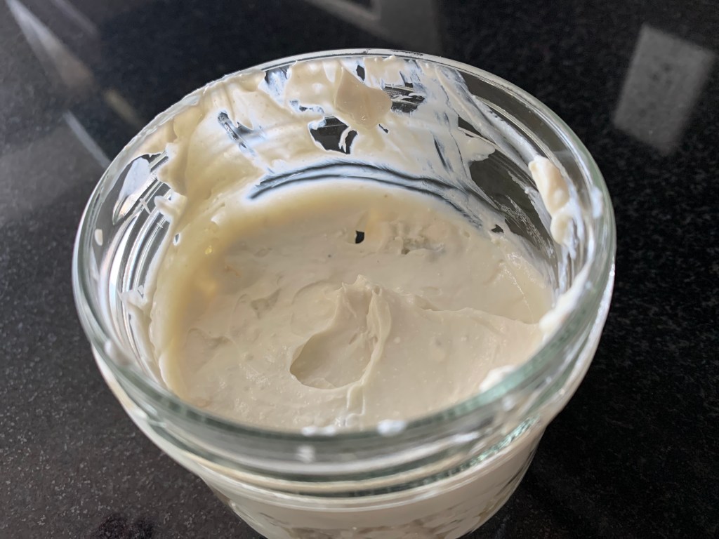 In a jar that goes. It’ll sit in the fridge until I’m ready to make my tartines and leftovers will be spread on crackers or celery sticks. It’s a lovely thing to have on hand.