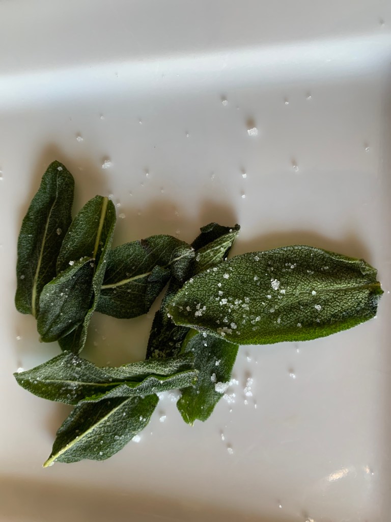 One last prep for my tartines: On medium-high heat I fry up the sage leaves in about 1/4 inch of olive oil until they’re crispy. They go onto paper towel to absorb the oil and get salted with fleur de sel. Crispy sage is really delicious.