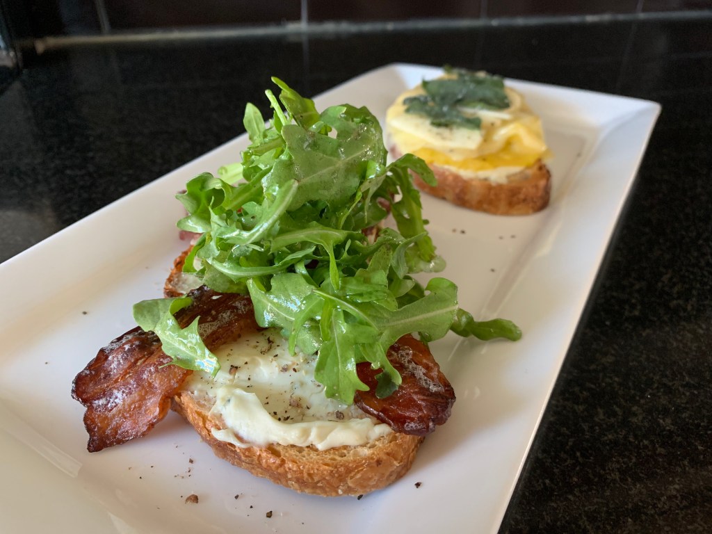 The bacon tartine is a study in contrasts. I’m actually not a fan of eating an arugula salad on its own, but it sings when paired with the bacon and blue cheese.