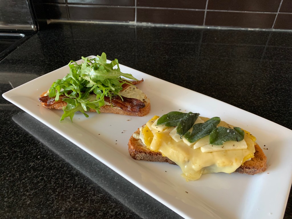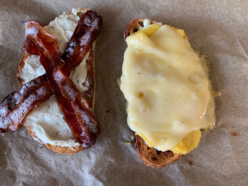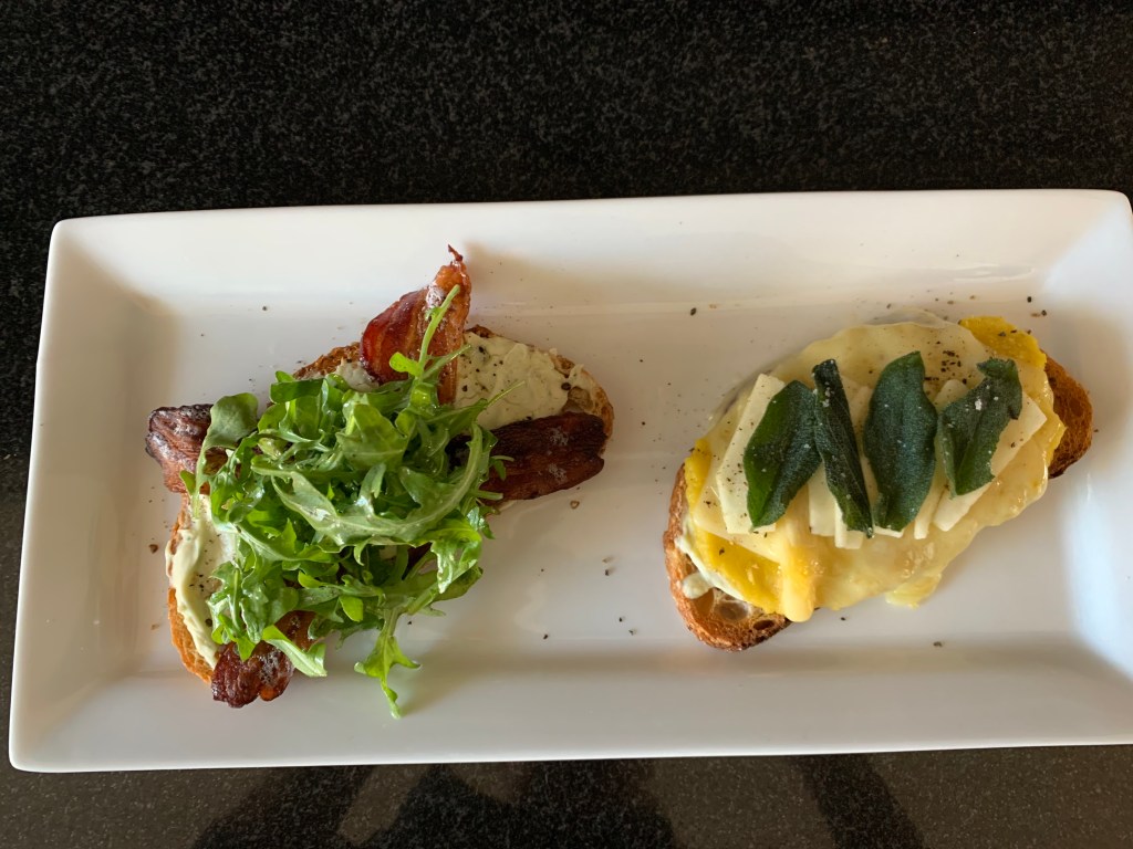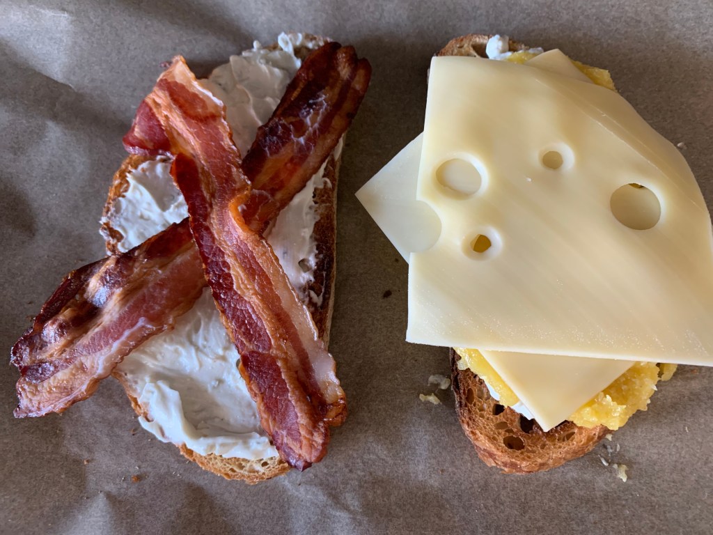 Squash puree goes down on one toast, bacon on the other. Top the squash puree with two slices of swiss cheese. That’s ready to go onto a baking sheet lined with parchment paper and under the broiler until the swiss cheese melts and the bacon crisps up (3-5 minutes depending on your broiler—keep close watch).