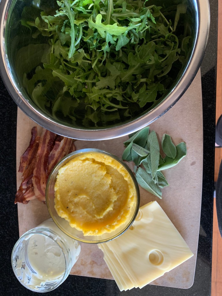 I’ve got leftover bacon from yesterday’s brunch, so that will get used for my bacon tartine. You could also crumble some into the squash puree but I’m wanting a vegetarian tartine.