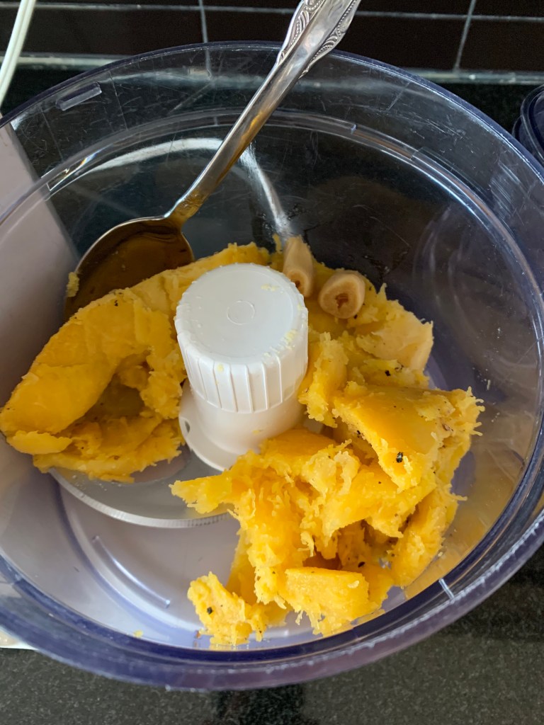 I take the squash out of the fridge and put it into my food processor along with salt, pepper, and 2 cloves of roasted garlic, which was also sitting in the fridge waiting to come in handy. Now you could go the more traditional route, flavouring the squash with nutmeg, cinnamon, maybe even a hint of brown sugar but I’m looking to tone down the natural sweetness of the squash. So I’m using bossy ingredients, like roasted garlic in the puree and blue cheese in the tartine.