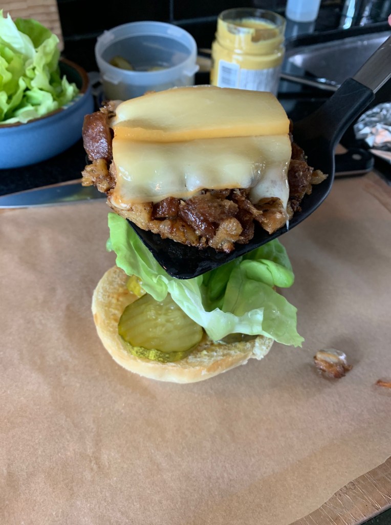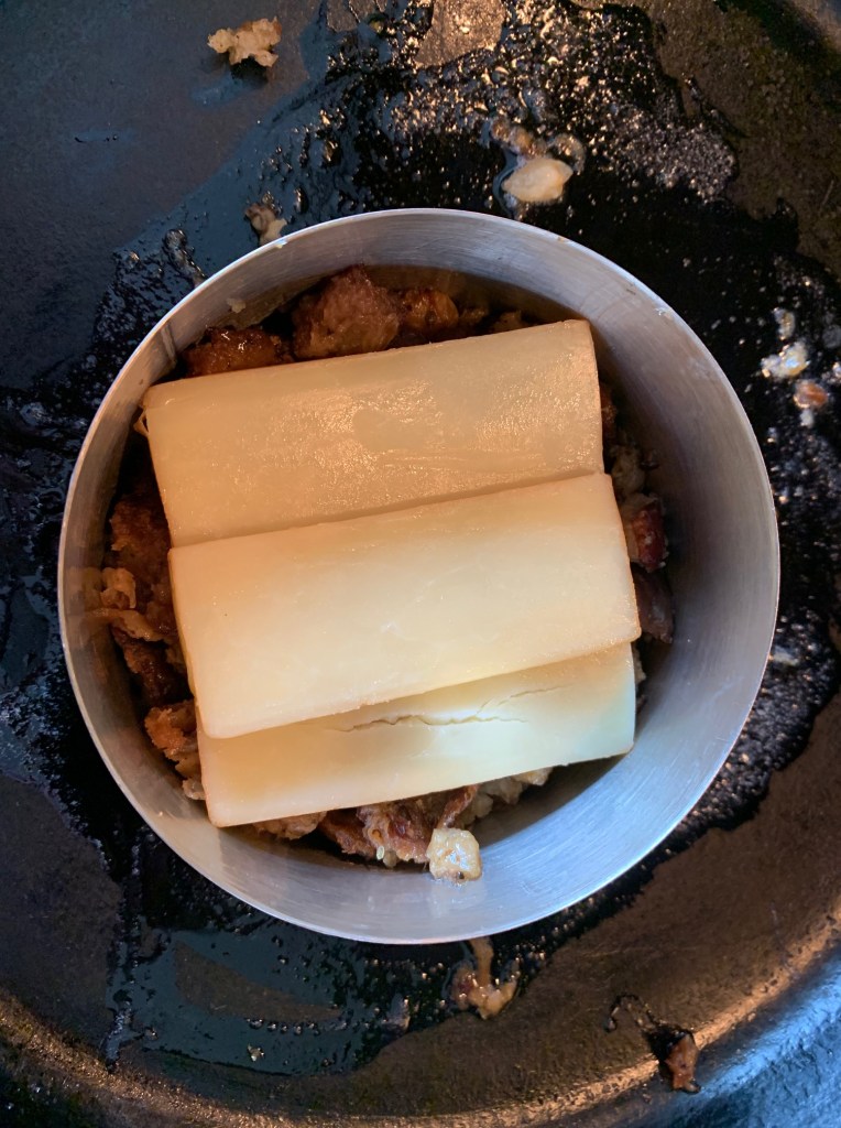 Cover the ring with a pot lid in order to trap the steam. That’ll keep the stuffing burger moist and encourage the cheese slices to melt enough to hold things together.