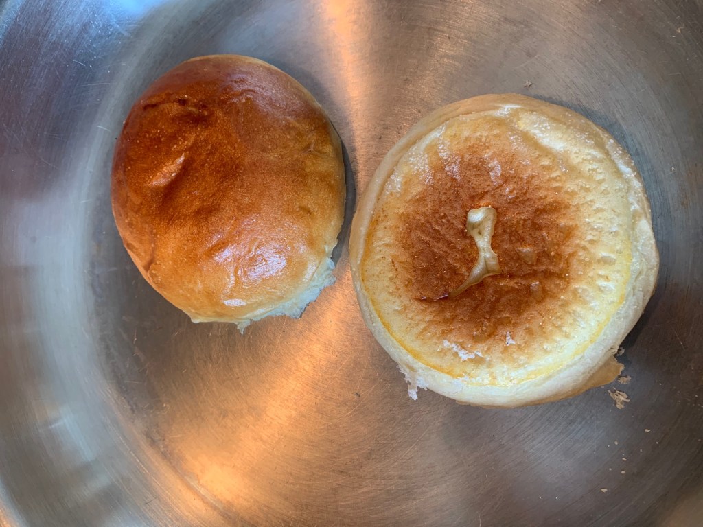 I’m using good Ace buns but you could toast bread instead. They’re going to get buttered ‘wall to wall’ and grilled, butter side down, in a fry pan until they’re golden brown.