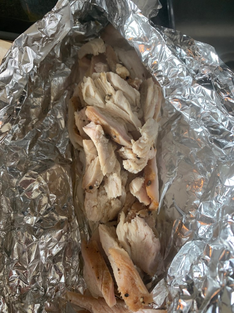 I get my leftover gravy simmering on low heat and put about two cups of turkey chunks into a foil packet.