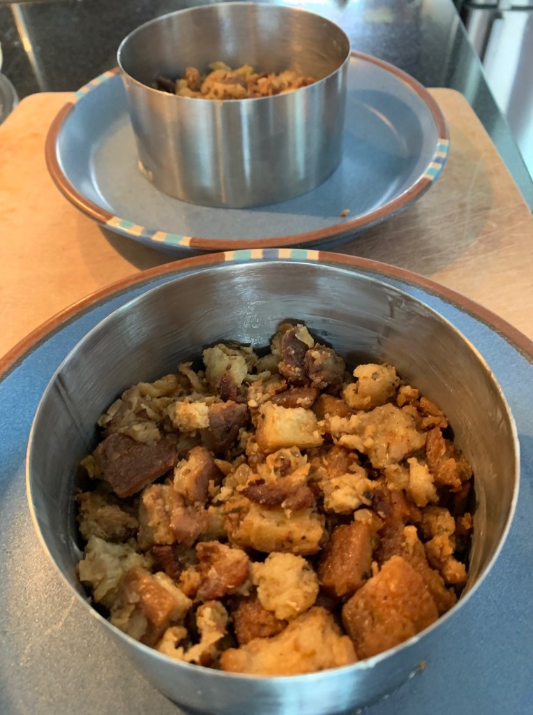 Now for the stuffing cheeseburger. This was Craig’s idea and it’s a keeper. Butter the inside of a metal cooking ring and place about 1/2 cup of stuffing into the ring. Pack it down to create the burger.