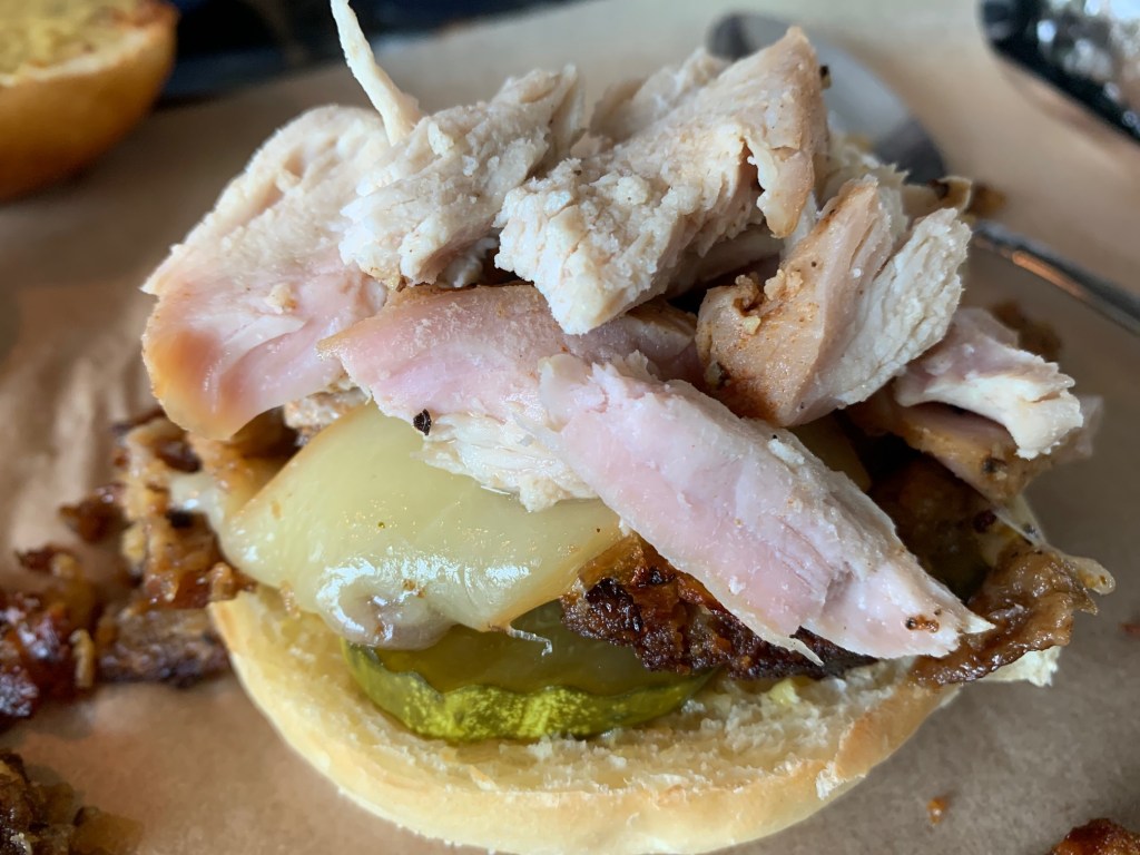 Then it slid off, so no lettuce is the way to go. Take the turkey out of it’s steaming packet and pile it on high.