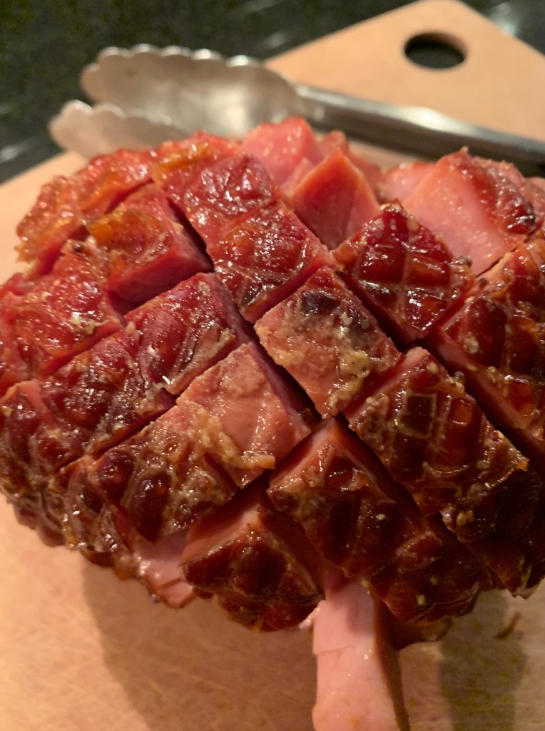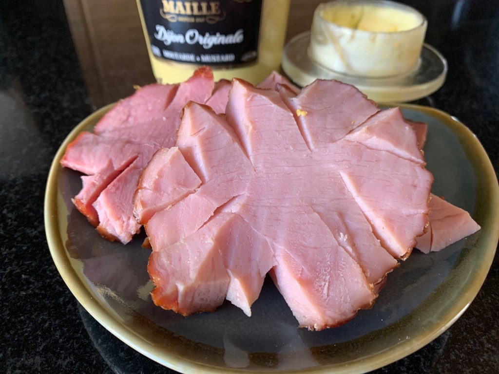 Thin slices of smoked meat goes down on my sandwich (there’s a spread of hot Keen’s mustard underneath there).